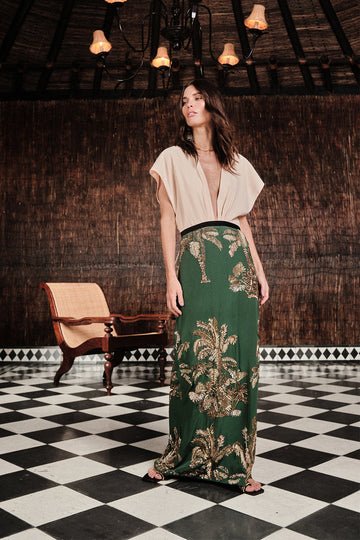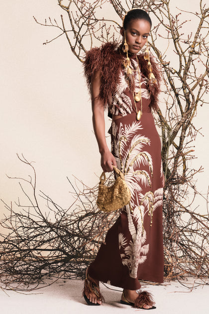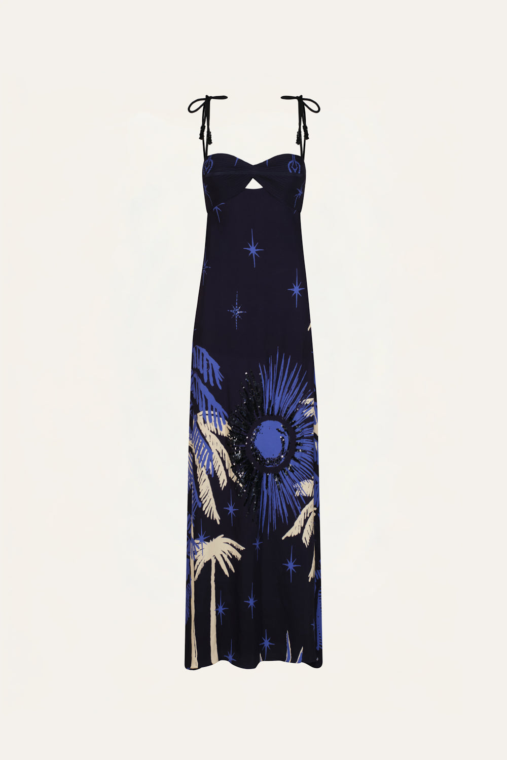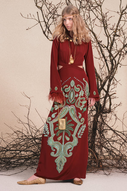 Styling Notes:Maxi dress in heavy crepe featuring an embroidered sun and palm design. Detailed with...