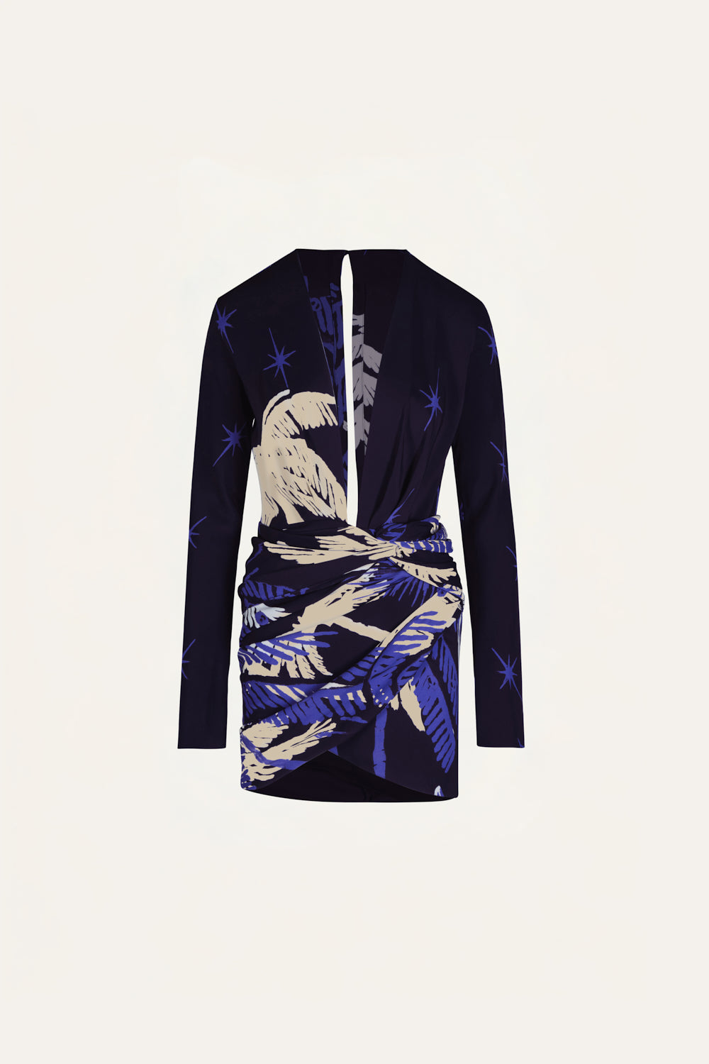 Styling Notes:Mini dress in heavy crepe featuring a JO palm motif in blue tones. Designed...