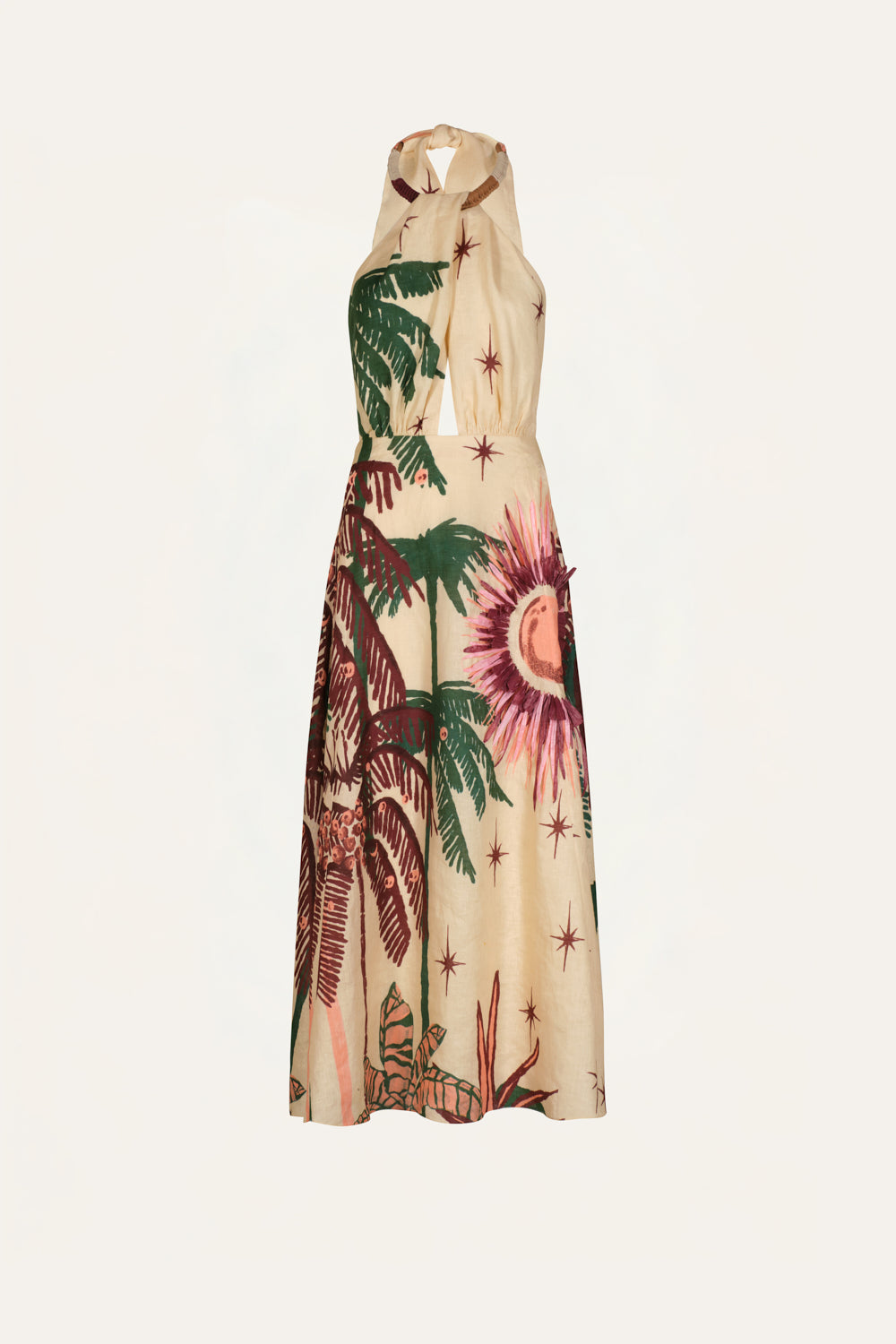 Styling Notes:A halter dress crafted from embroidered linen, featuring an open back and a vibrant...