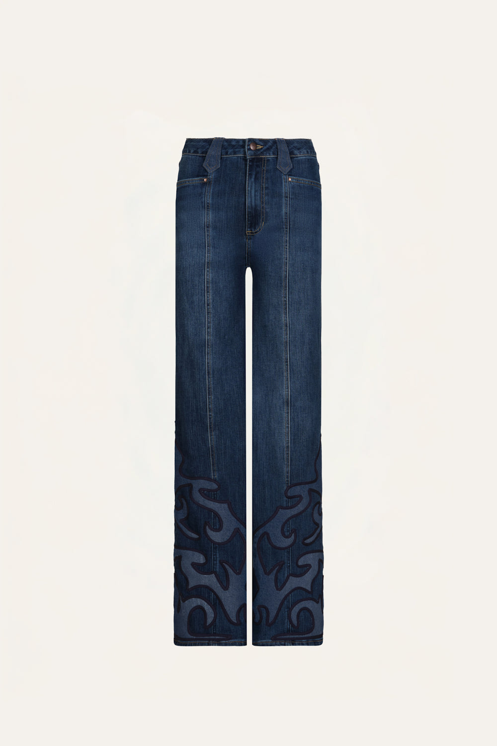 Styling Notes:Denim pants detailed with tonal embroidery along the hem. Designed with a flared silhouette...