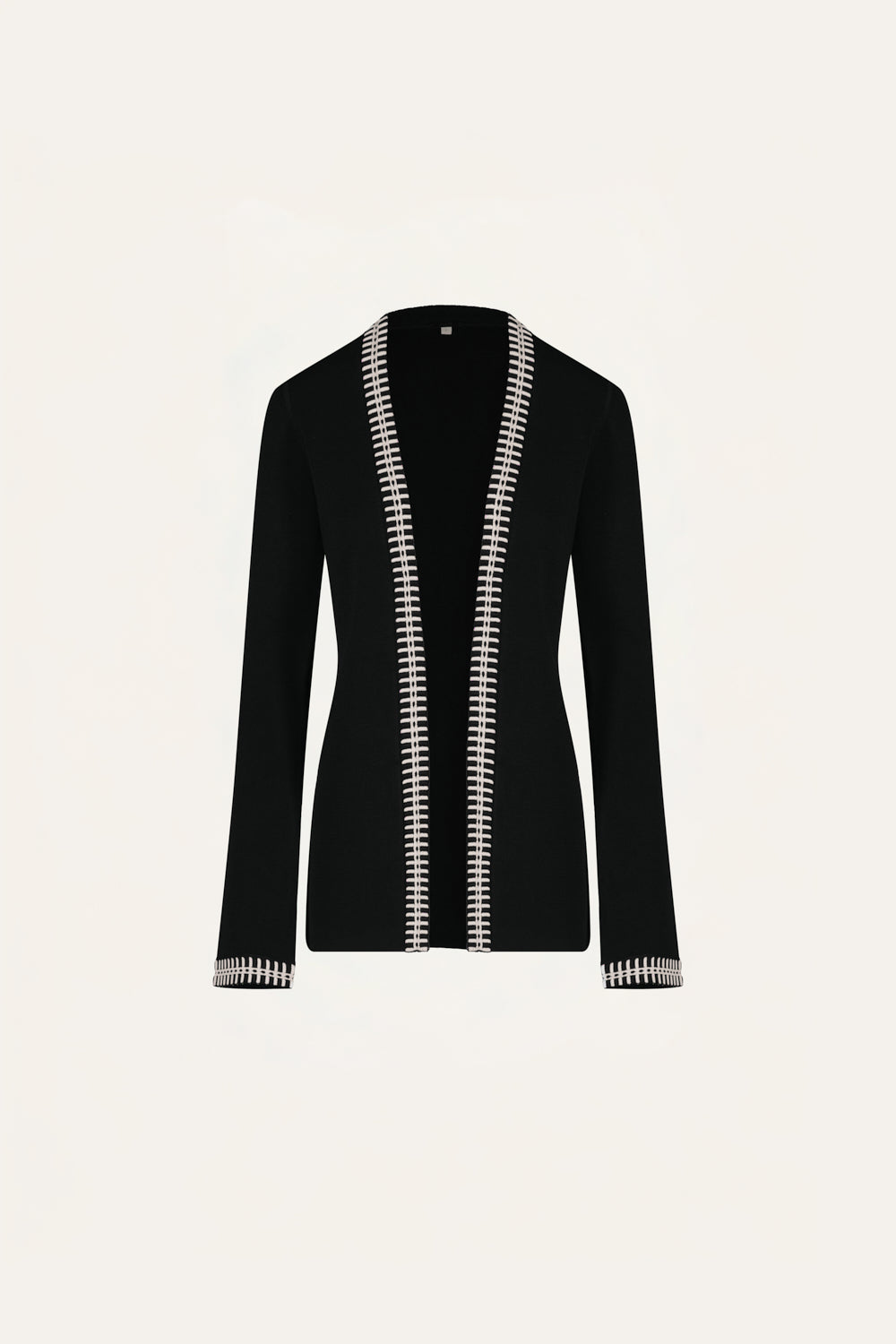 Styling Notes:Knit cardigan detailed with contrasting trims along the edges. Designed with an open front...